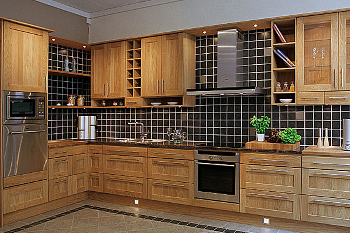 Kök i ek – ett klassiskt val som aldrig känns omodernt. Rubin Ek är ett kök med massiva köksluckor i ek. Här med spotlights under väggskåpen och hyllorna, med bänkskiva i sten. Ek är ett hårt och tåligt träslag som åldras vackert och väl.