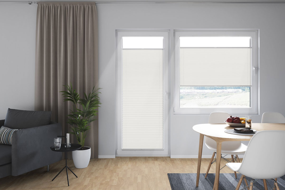 Plissegardin Flex® regleras enkelt med ett handtag på listen, både nerifrån/upp samt uppifrån/ner. Denna modell fungerar således både som ett solskydd men också som ett utmärkt insynsskydd. Maxbredd 1500 mm.