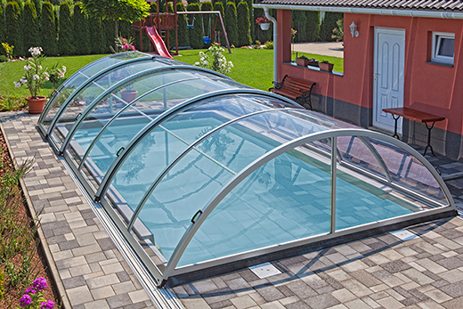 Ett poolöverdrag eller skjutbart pooltak ger god säkerhet. Har poolen oregelbunden form, eller om du vill kunna ta spontandopp kan en inhägnad vara ett bra alternativ. Sätt inhägnaden en bit från poolen och gör fint med gröna växter. På bilden ett pooltak från Gullberg & Jansson.