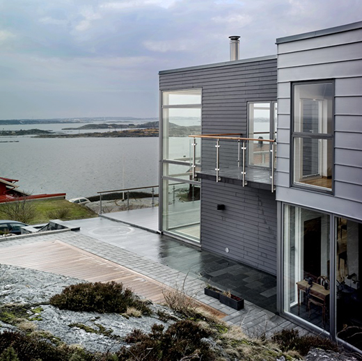 Här en bostad i två olika grå toner av fibercement som smälter fint in i den omgivande naturen.